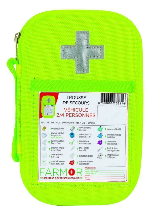 Trousse en PU jaune fluo avec poignée. Multipoches de rangement et passant ceinture. Pour les véhicules tous métiers confondus. Répond au code du travail (Art R 4224-14) qui stipule que le matériel de premiers secours est obligatoire et doit être facilement accessible. Couverture de survie incluse. | Dimensions : 215 x 135 x 60 mm