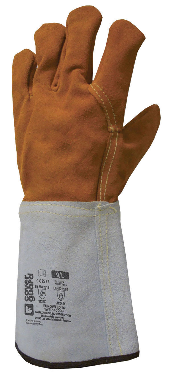 Gants croûte de vachette supérieure orange avec traitement ignifugé. Coutures Kevlar®. Intérieur molletonné. Manchette de sécurité en croûte. | Longueur : 15 cm.