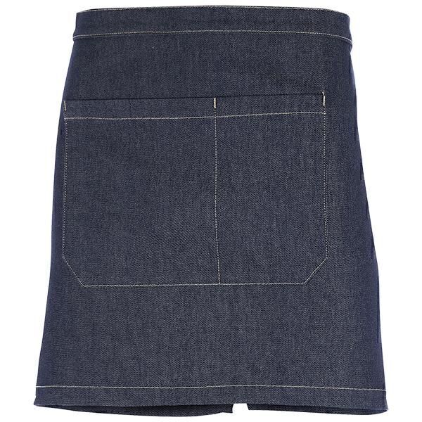 Tablier. Liens fixes en tresse beige. Poche centrale à double compartiment. Matière jean avec surpiqûres beige. Longueur : 92 cm