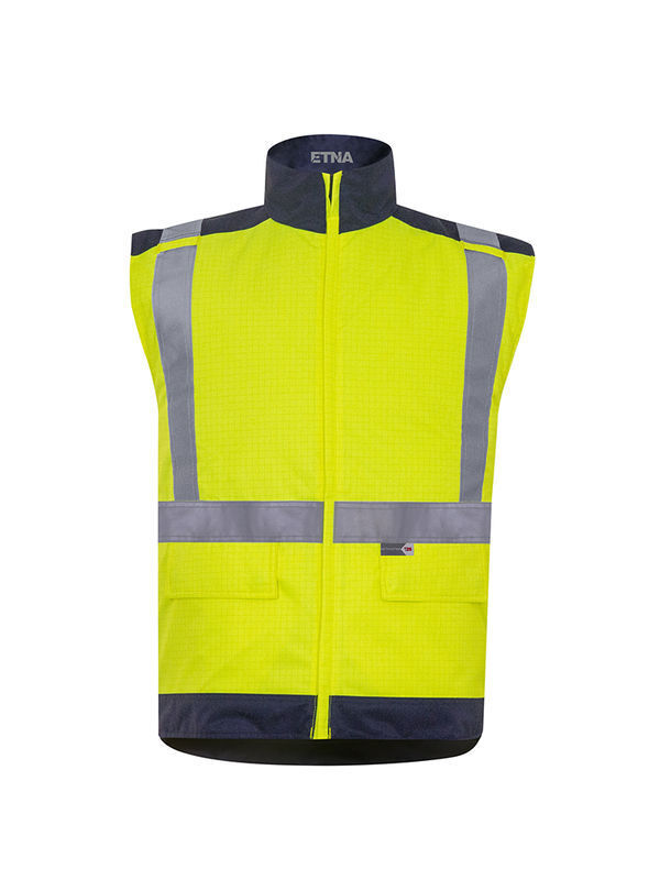 Gilet à col officier. Fermeture à glissière, double passepoils. 2 pattes de fixation poitrine pour micro déporté. 2 poches avec rabat à boutons-pression. Poche intérieure fermée par bouton-pression. Dos protège-reins. Ceinture et 2 bretelles rétroréfléchissantes microbilles RETHIOTEX® non feu de 5 cm cousues. Tissu Wovetex Stop Flamme sergé ignifugé et antistatique. Doublure fixe matelassée ignifugée. | Mercerie tout plastique. Fit&Zip : fixation dans la parka ETNA.