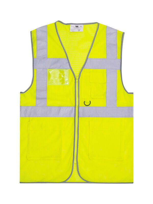 Gilet haute visibilité multi-poches. Fermeture centrale à glissière. 2 poches plaquées à soufflet avec rabat fermé par auto-agrippant. Porte-badge translucide (10 x 7 cm). Poche portable avec compartiment stylo fermée par rabat. Anneau plastique D . | Bandes rétroréfléchissantes microbilles RETHIOTEX® 50 mm cousues + Système LED.