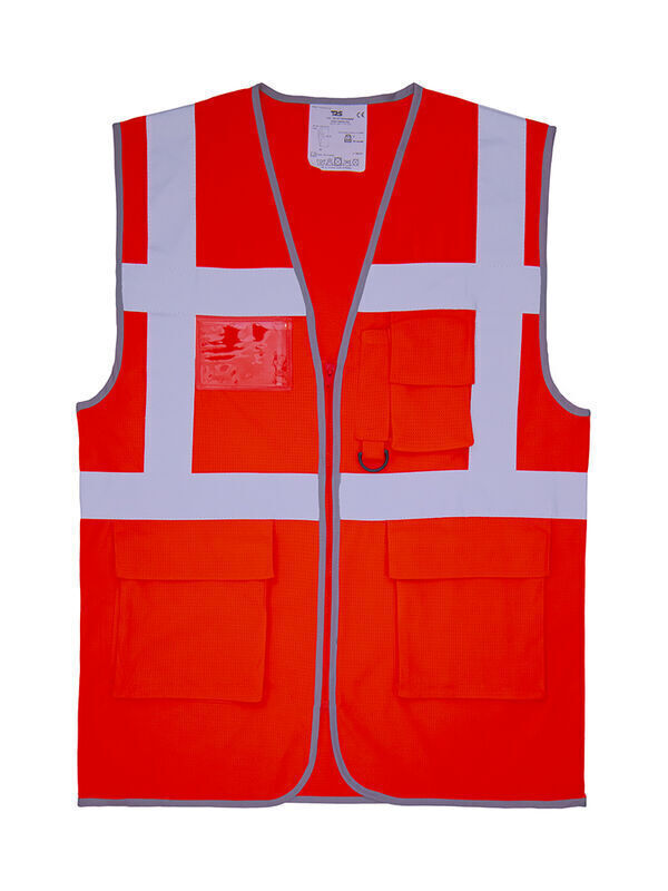 Gilet haute visibilité multi-poches. Fermeture centrale à glissière. 2 poches plaquées à soufflet avec rabat fermé par auto-agrippant. Porte-badge translucide (10 x 7 cm). Poche portable avec compartiment stylo fermée par rabat. Anneau plastique D . | Bandes rétroréfléchissantes microbilles RETHIOTEX® 50 mm cousues + Système LED.