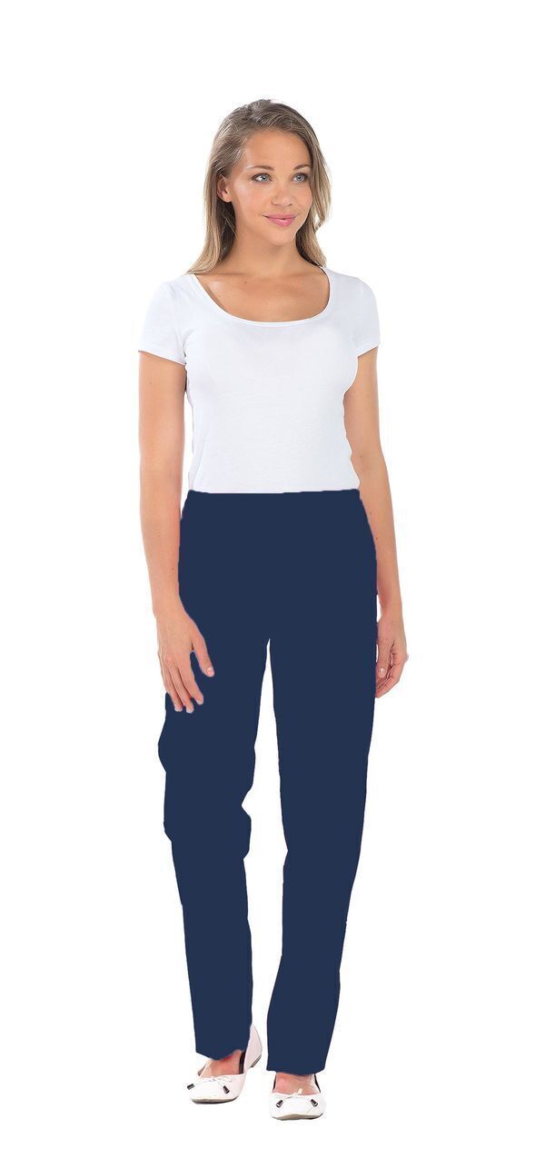 Pantalon femme. Taille semi-élastiquée effet ventre plat. 2 poches italiennes. E.J. : 82 cm.