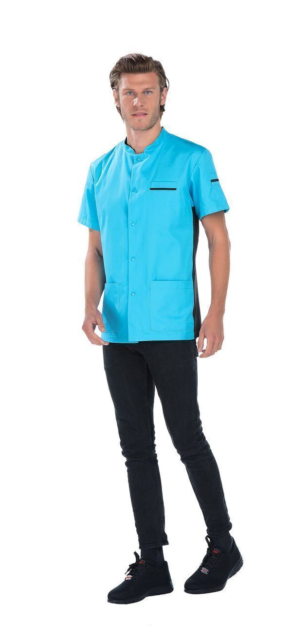 Tunique mixte. Fermeture milieu devant par boutons-pression. 2 poches basses. 1 poche BIP dans la poche gauche. Poche poitrine passepoilée. 1 poche stylo sur manche gauche. Manches courtes. Maille côtés, dos des manches et intérieur du col. Fentes dos. Longueur : 75 cm.