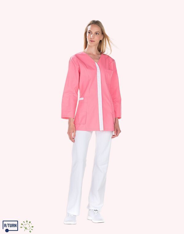 Tunique encolure V. Fermeture milieu devant par boutons-pression, parement contrasté. Découpe de cintrage. Poche poitrine, poche BIP. 2 poches basses semi-volantes. 2 fentes dos. Longueur : 75 cm.