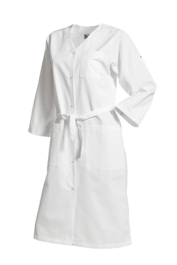 Blouse femme encolure V. Fermeture milieu devant par 6 grippers. Ceinture amovible. Poche poitrine et 2 poches basses plaquées. Manches transformables avec pattes pressionnées. Longueur : 105 cm.