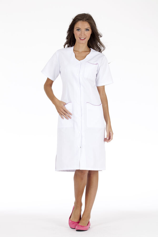 Blouse femme. Encolure fantaisie. Fermeture milieu devant par 7 boutons-pression couleur ton sur ton. Poche poitrine avec passepoil contrasté. 2 poches basses plaquées avec passepoil contrasté. Fentes côtés. Manches courtes. Coupe cintrée. Longueur : 100 cm.