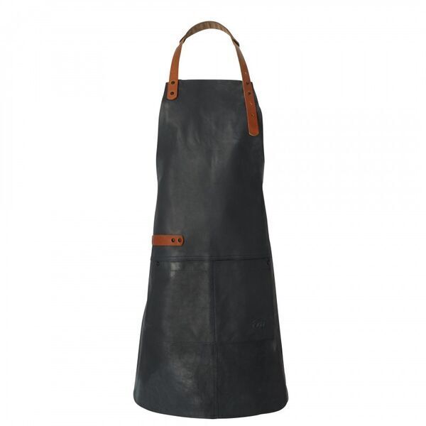 Tablier cuir à bavette. Tour de cou réglable. Rivets de renfort. Ceinture réglable avec possibilité de bloquer l’extrémité de la sangle ceinture. Grande double poche. Accroche torchon. Longueur : 84 cm