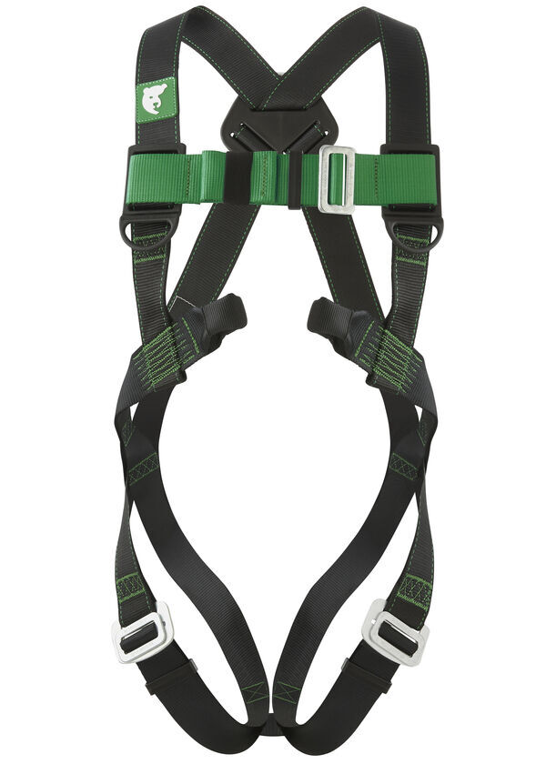 Harnais 2 points : 1 dé dorsal et 1 point d'accrochage sternal par boucles textile. Bouclerie manuelle. Sangles sternales et cuissardes réglables. 2 anneaux portes longes.