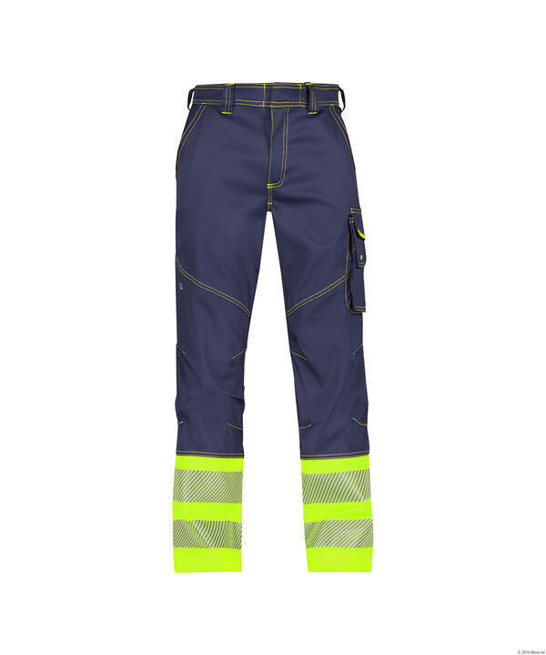 Pantalon stretch classe 1. Ceinture fermeture à glissière et bouton jeans caché, réglable au dos par élastique. 6 passants. 2 poches italiennes. Poche cuisse. Porte-crayon, poche mètre, poche cutter, poche téléphone et boucle pour porte-badge. Poches arrière plaquées dont 1 avec rabat. Poche de sécurité cachée avec fermeture à glissière. Coutures triples. Bandes réfléchissantes segmentées de 80 mm. Coupe ajustée.
