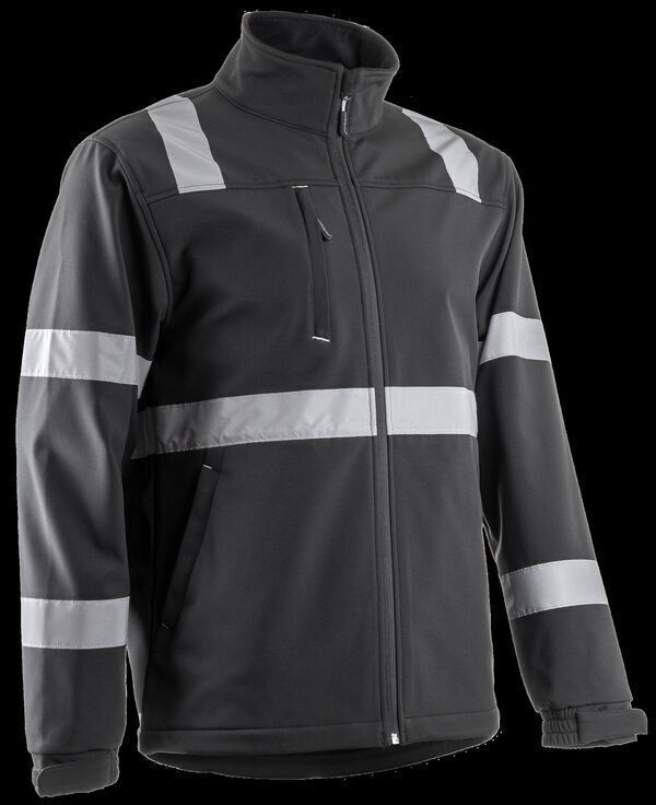 Softshell 3 couches. Col montant. Fermeture à glissière avec protège menton. Poche poitrine zippée sous passepoil. 2 poches basses avec fermeture à glissière sous passepoil. Bas réglable par cordon élastiqué. Poignets semi-élastiqués réglables par patte auto-agrippante. | Bandes rétroréfléchissantes cousues microbilles 50 mm.