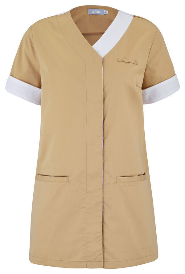 Blouse femme. Fermeture milieu devant par boutons-pression cachés. Passant porte-badge côté gauche, 2 poches passepoilées dont une à 3 compartiments et 1 passant pendoir côté. Œillets d'aération brodés sous les bras, manches courtes retroussables avec bas de manches revers contrastés. Longueur : 75 cm.